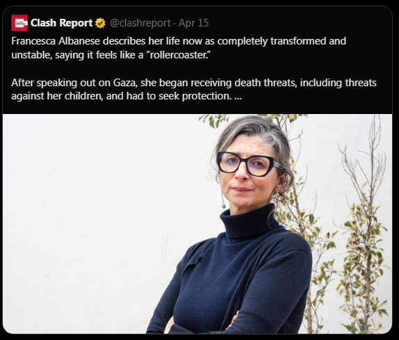 تازترین نمونه آنرا میتوان از زبان فرانچسکا آلبانزه، حقوقدان ایتالیایی و گزارشگر ویژه سازمان ملل در امور حقوق بشر در سرزمینهای فلسطینی اشغالی، شنید . او که پس از انتشار گزارش معروف خود با عنوان «کالبدشناسی یک نسلکشی» در مارس ۲۰۲۴، با موجی از تهدید، فشار سیاسی، تحریم شخصی و حملات سازمانیافته روبهرو شد. گفتوگوی مفصل جولیان بورگر با او در روزنامه گاردین، تصویری نزدیک و انسانی از زندگی زنی به دست میدهد که در برابر یکی از خونبارترین فجایع زمانه ما، تصمیم گرفته سکوت نکند.